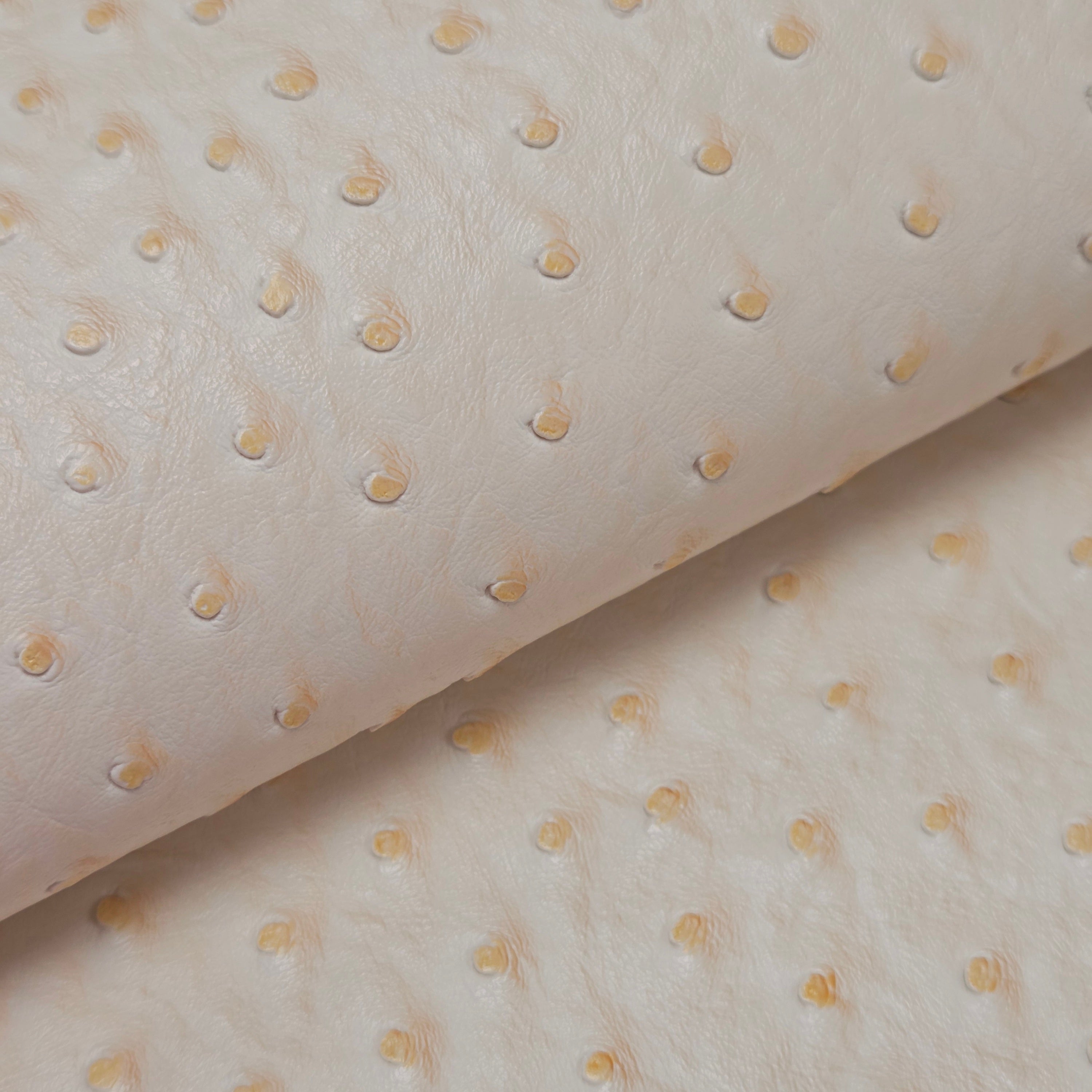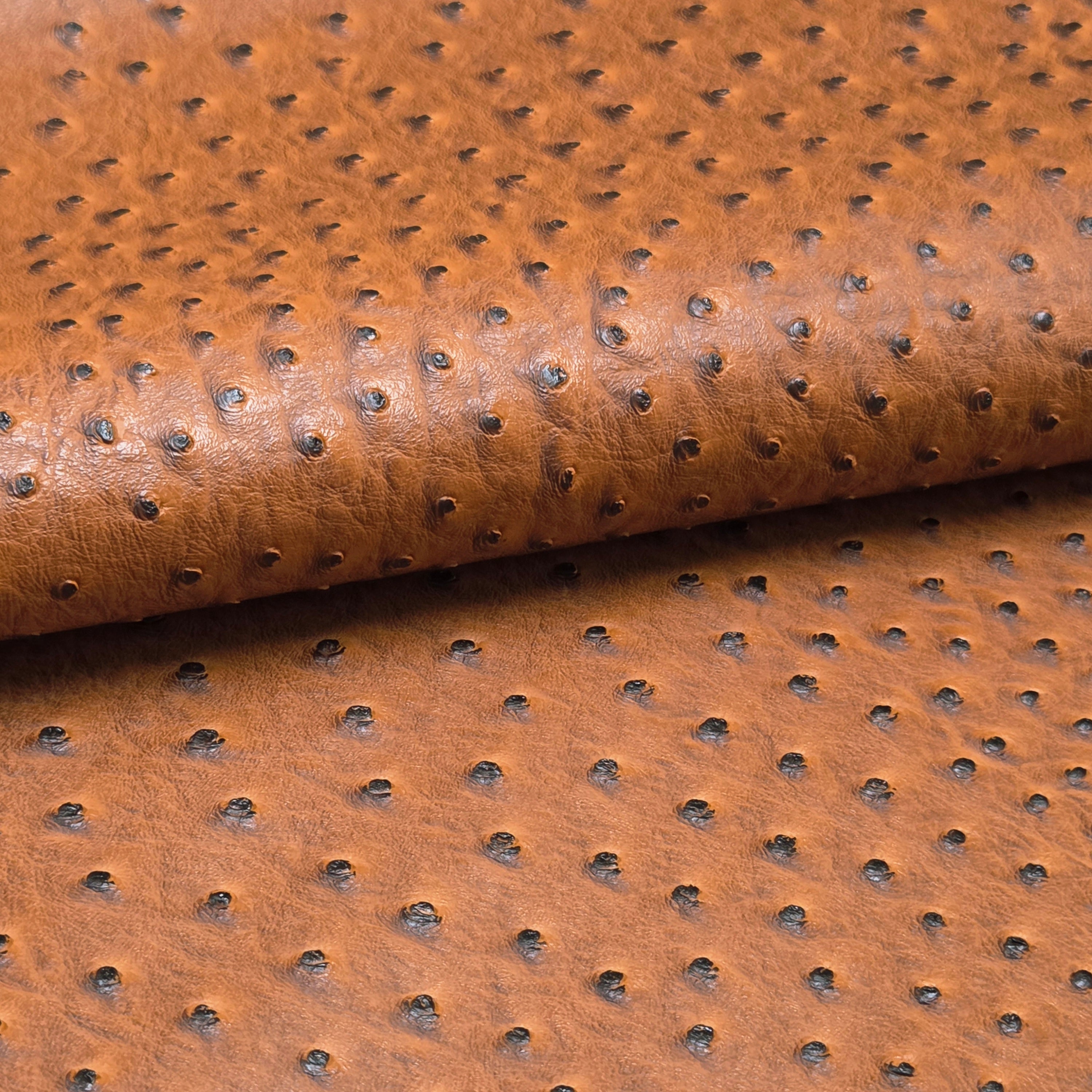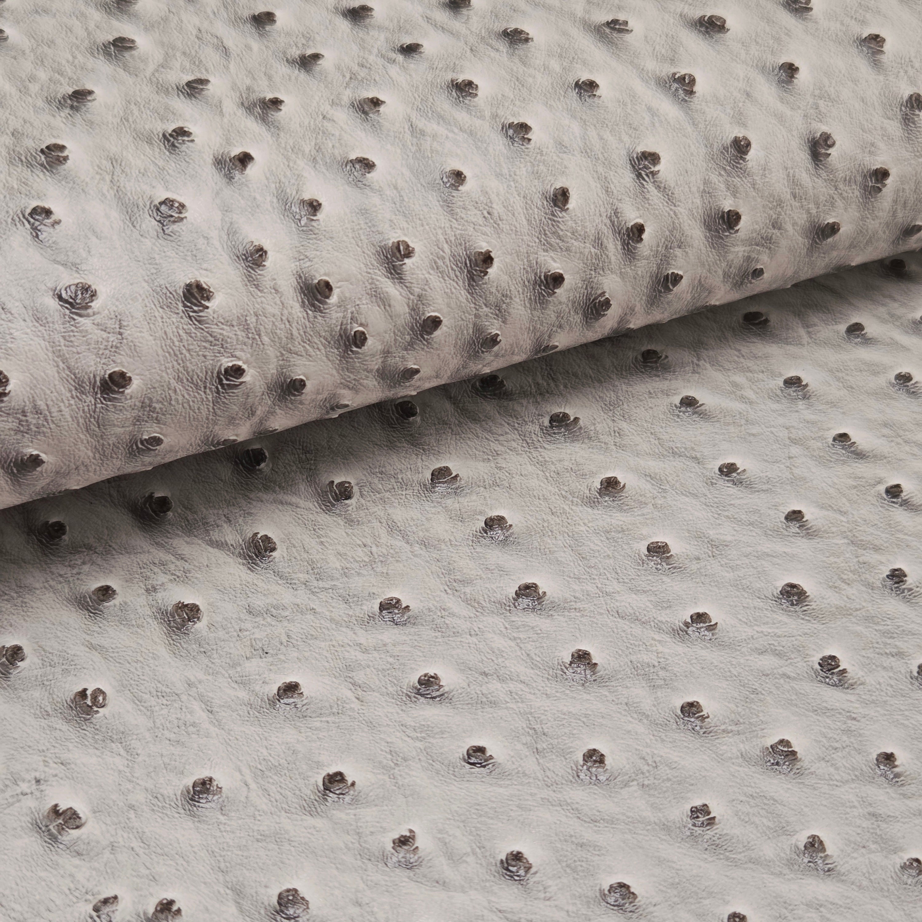 Embossed ostrich-texture faux leather featuring a dimensional quill pattern with consistent grain throughout. Medium body with structured feel—ideal for projects requiring stability while maintaining manageable flexibility.