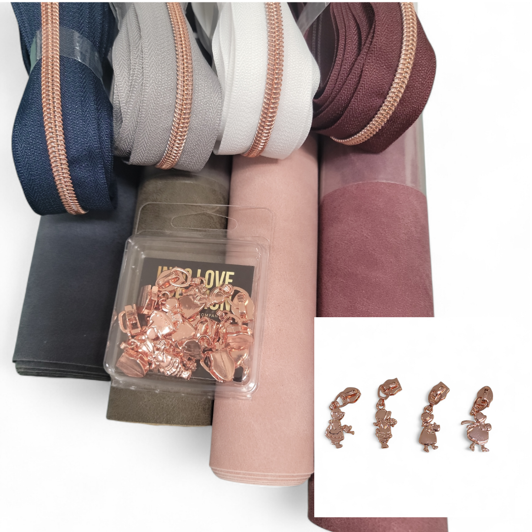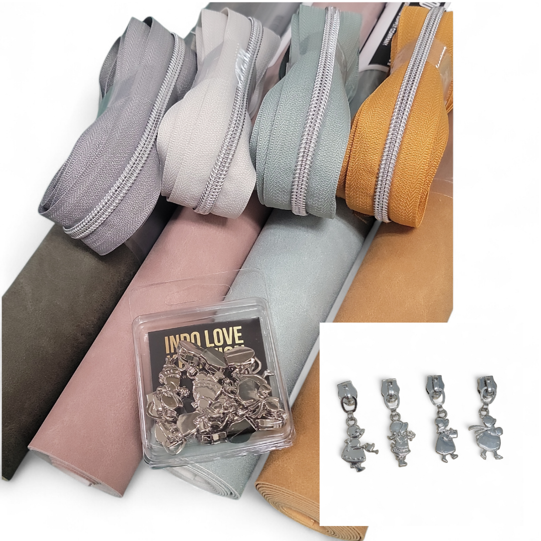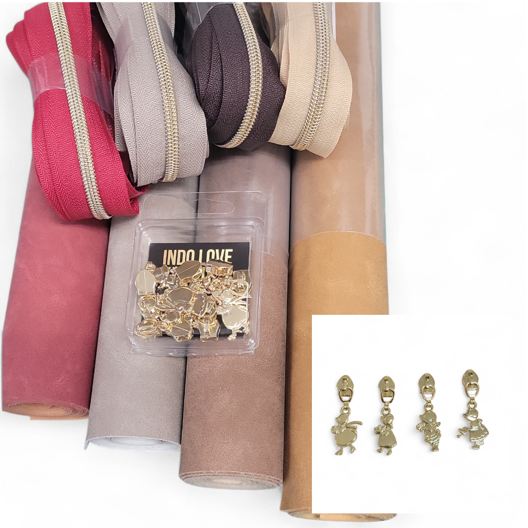 A thoughtfully curated bundle featuring our signature KAYA faux suede vinyl, a matching or complementary zipper tape, and 8 Sue Bonnet zipper pulls—designed in Spring, Summer, Fall, and Winter.